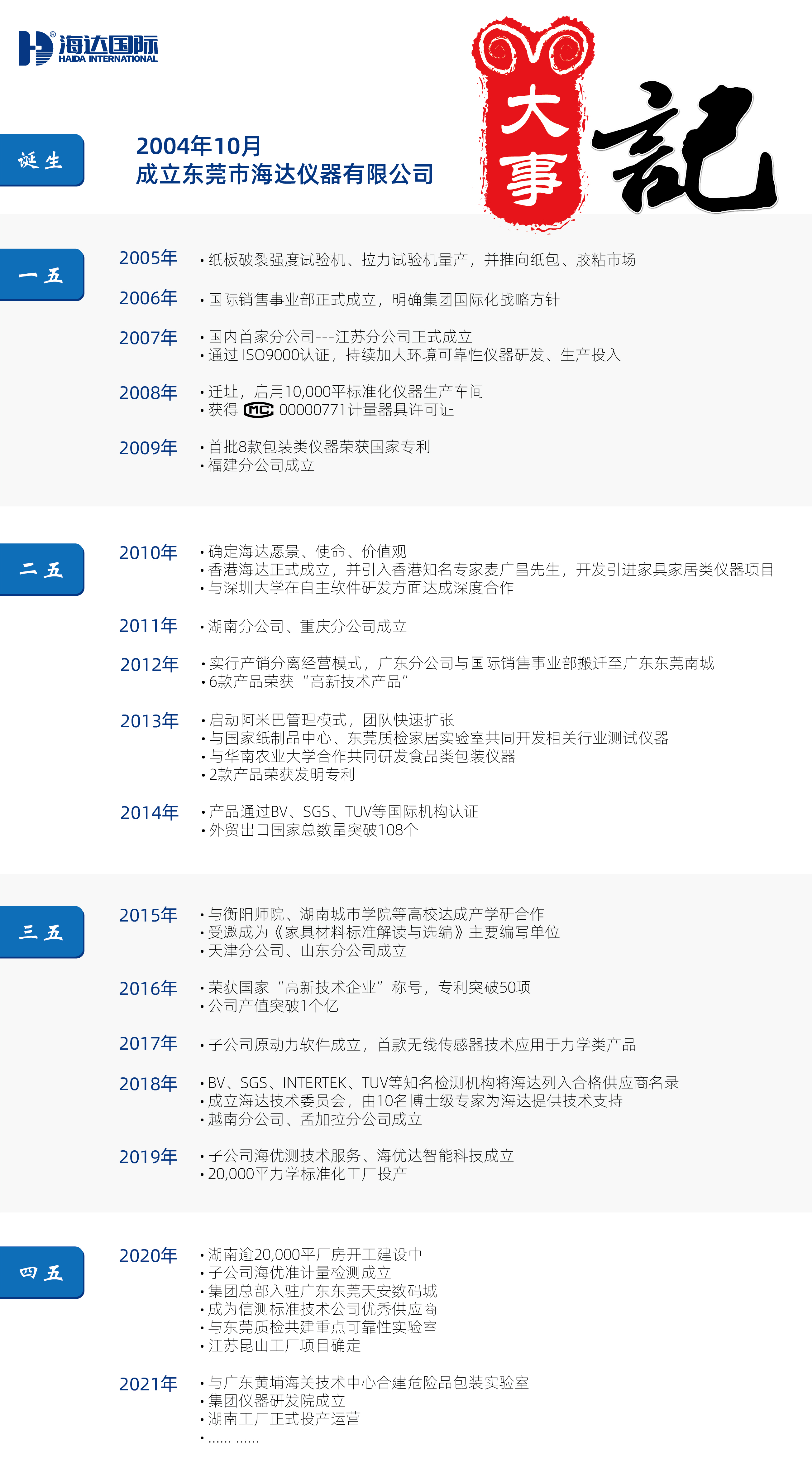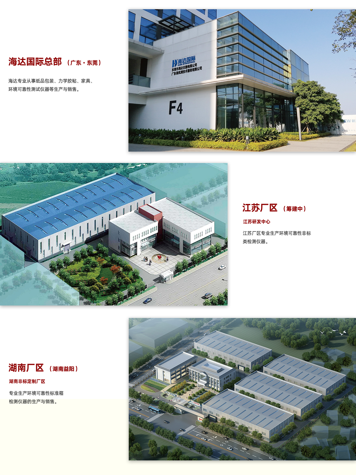 主营业务范围:仪器生产、非标仪器定制、软件开发、计量检测及维修咨询整包服务。公司通过ISO9000认证以及国际知名检测机构BV、SGS、TUV的多次认证,产品符合GB、ISO、ASTM、EN、JIS、TAPPI、ISTA、DIN、BS等国内外标准。投入大量研发资金,坚持研发一代、销售一代、储备一代的产品理念,始终走在行业的前端。参与家具测试标准编写,与国家质检单位共同起草CY/T229-2020行业标准;与国家纸制品中心、东莞质检家居实验室共同开发行业测试仪器;并与多家知名单位共建可靠性实验室,与黄埔海关技术中心合建危险品包装实验室。
