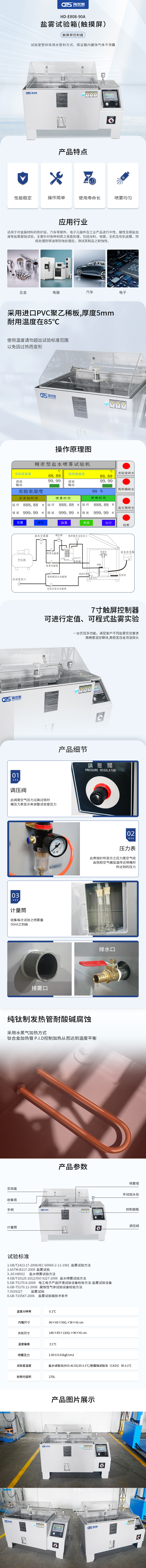 HD-E808-90盐雾机是适用于对金属材料的防护层、汽车零部件、电子元器件及工业产品进行中性、酸性及铜盐加速等盐雾腐蚀试验。主要针对各种材质之表面处理,包括涂料、电镀、无机及有机皮膜,阴极处理防锈油等防蚀处理后,测试其制品之耐蚀性。