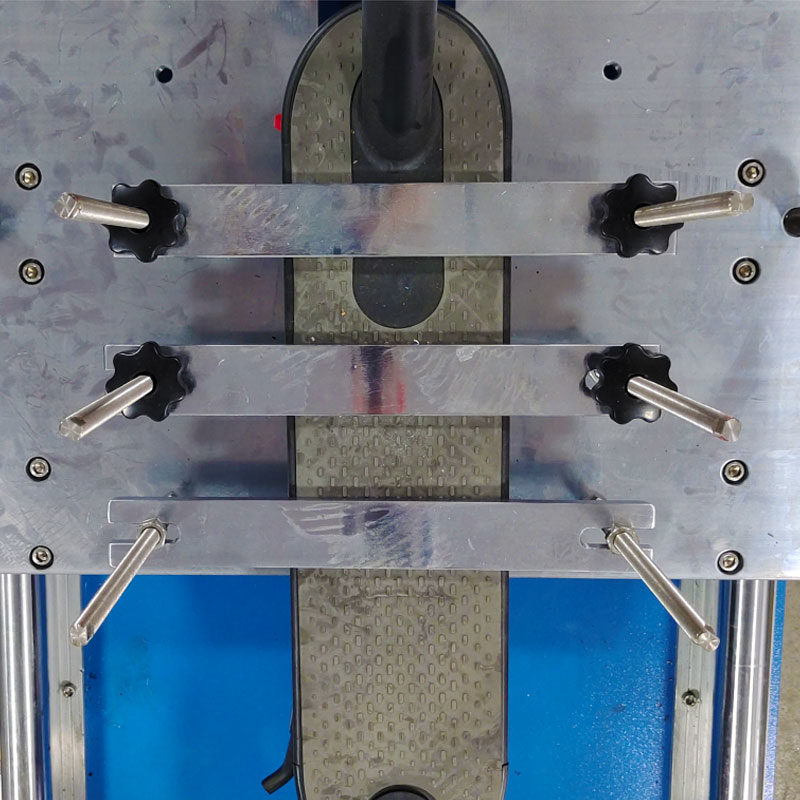 龙头/把手杆疲劳测试:固定滑板车平台使其不能移动,并固定前轮,使其不能顺转向轴转动。在距把手两端各1英寸(2.5 厘米)处施加与垂直方向成45度向上/向后大小为60磅的拉力(267N),然后往相反方向(向下/向前)施加压力。重复该过程5000次,速度不超过3-5次每秒。