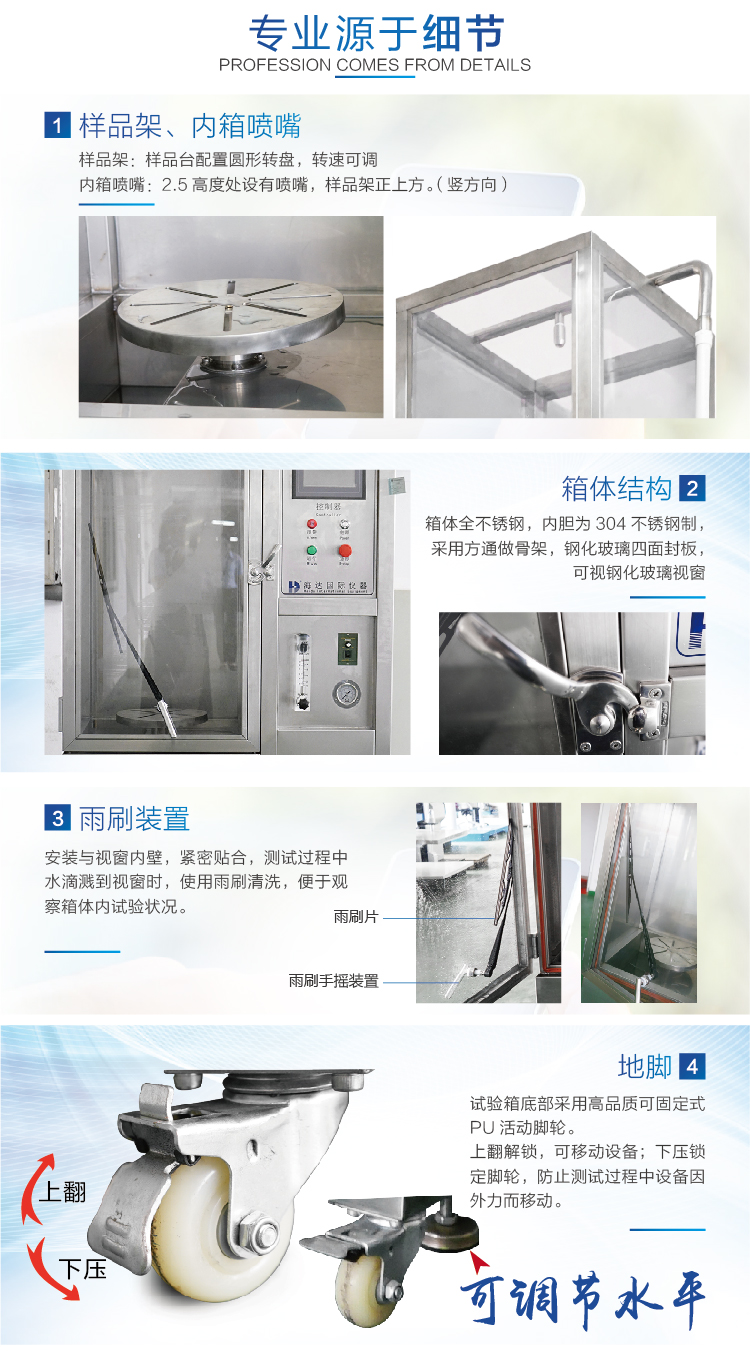 二、IP65防水测试仪器产品介绍:HD-E710-IP65防水测试仪器适用于测试产品在淋雨的气候环境下的贮存、运输和使用时的性能试验,该设备主要用于对电工电子产品、灯具、电柜、电器元件、汽车、摩托车及其零部件等产品在模拟淋雨的气候条件下,对产品的物理以及其它相关性能进行测试。