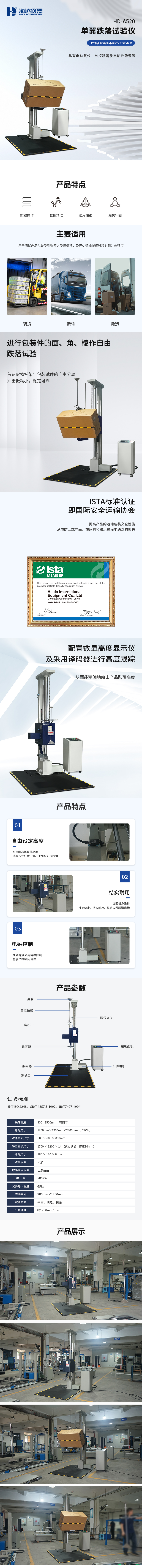 跌落试验机专用于测试产品包装受到坠落之受损情况,及评估运输搬运过程时耐冲击强度。采用双柱导向、高度跌落次数可置,工作稳定可靠,可实现棱、面、角跌落,满足GB/T4857.5-92、ISO2248-1972E。