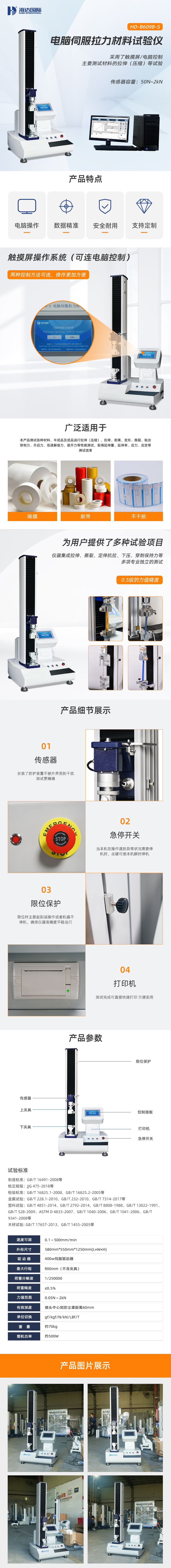 本产品主要可测各种材料之拉力、撕裂、剥离、粘接力……抗力物性。可打印出测试日期、时间及显示器设定之显示值。本机可配各式夹具及伸长量测试装置,或依客户需求装配。