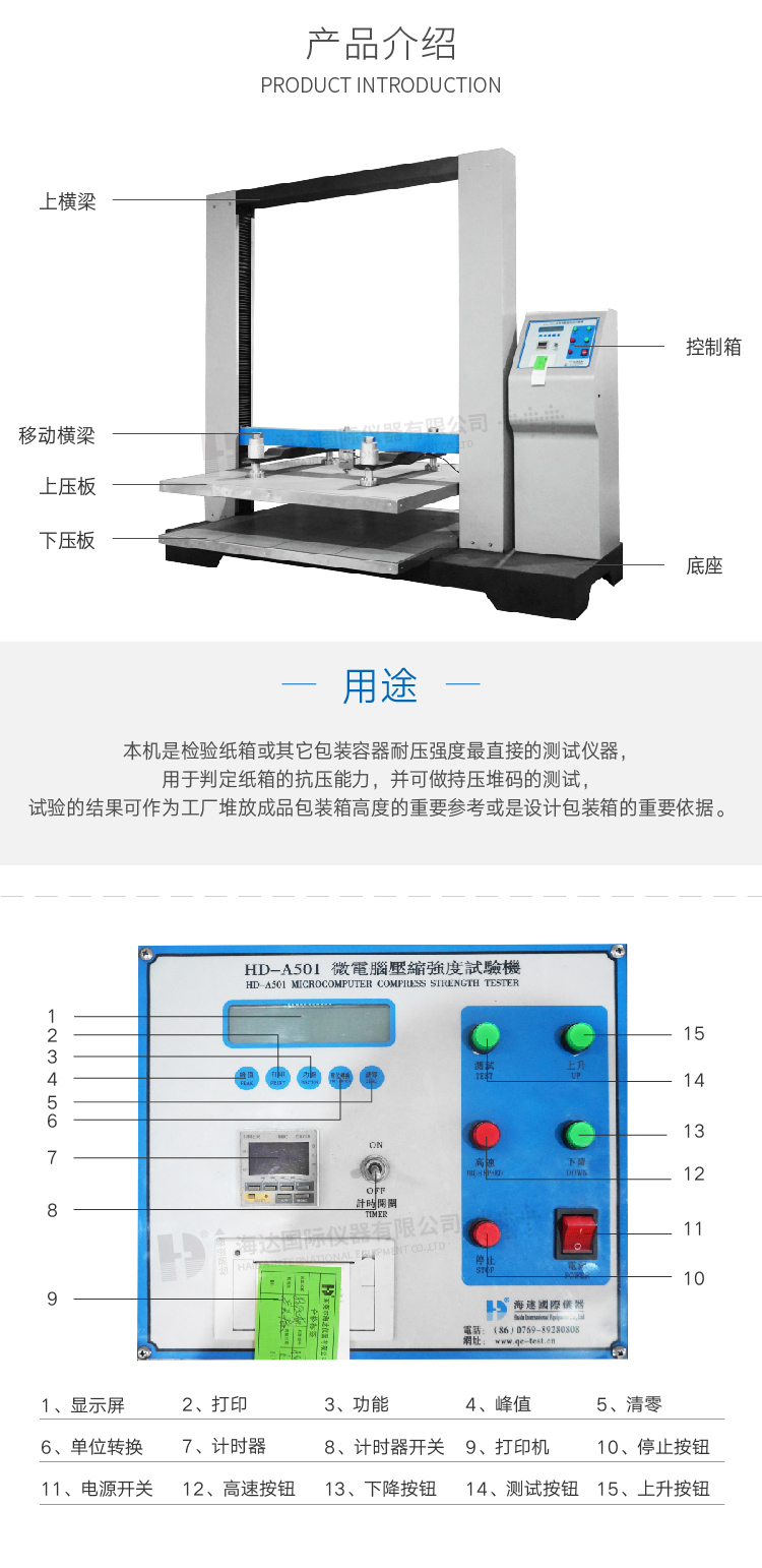 【欢迎咨询】 非常感谢您光临本网站,您所看到是的我司研发制造的纸箱耐压试验机产品的详细介绍,如有疑问,或者需了解更多产品详情请现在登陆:或者直到致电我司国内统一服务专线电话:88888888 可以得到更多您所需要求相关产品详情和咨讯,现在电话咨询并在此网站留言定购,9折优惠。