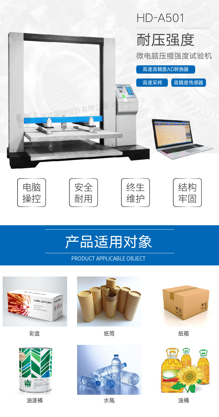 纸箱耐压试验机是检验纸箱或其它包装容器耐压强度直接的测试仪器,用于判定纸箱的抗压能力,并可做持压堆码的测试,试验的结果可作为工厂堆放成品包装箱高度的重要参考或是设计包装箱的重要依据。