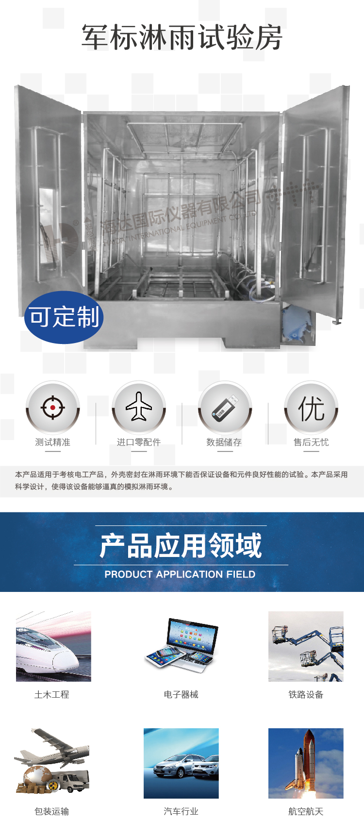 主要用于检测户外快递柜、机动车、铁道车辆及周边设备的防水密封性,指被试产品在淋雨条件下,产品防止雨水渗透的能力和遭到淋雨时或淋雨后的防雨性能。检查车窗与天窗安装方法是否正确;车体顶面、侧面能否承受住雨水的喷射。考核电工电子产品外壳、密封件在水试验后或者在试验期间是否能保证该设备及元器件良好的工作性能和技术状态。(考虑到产品的运输过程或使用中可能受到浸水的影响,为产品技术标准提供引用依据。)