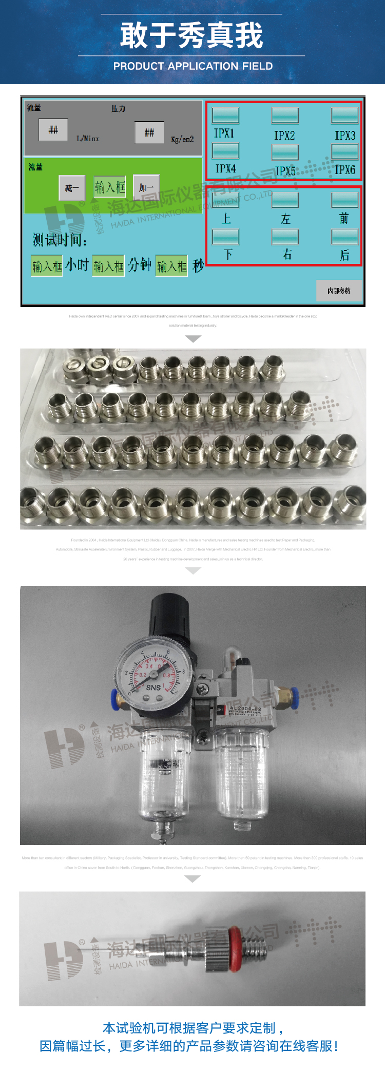 主要用于检测户外快递柜、机动车、铁道车辆及周边设备的防水密封性,指被试产品在淋雨条件下,产品防止雨水渗透的能力和遭到淋雨时或淋雨后的防雨性能。检查车窗与天窗安装方法是否正确;车体顶面、侧面能否承受住雨水的喷射。考核电工电子产品外壳、密封件在水试验后或者在试验期间是否能保证该设备及元器件良好的工作性能和技术状态。(考虑到产品的运输过程或使用中可能受到浸水的影响,为产品技术标准提供引用依据。)