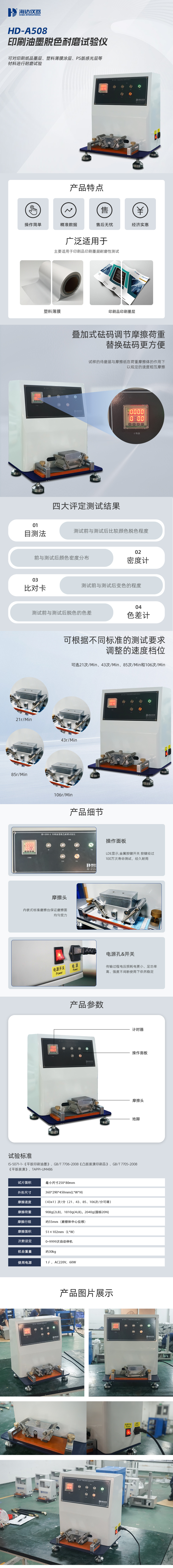 HD-A508印刷油墨脱色耐磨试验仪主要适用于印刷品印刷墨层耐磨性测试。将标准尺寸的摩擦纸包于摩擦头,以规定的速度、压力等对试样表面进行摩擦,观察试样墨层脱落情况。