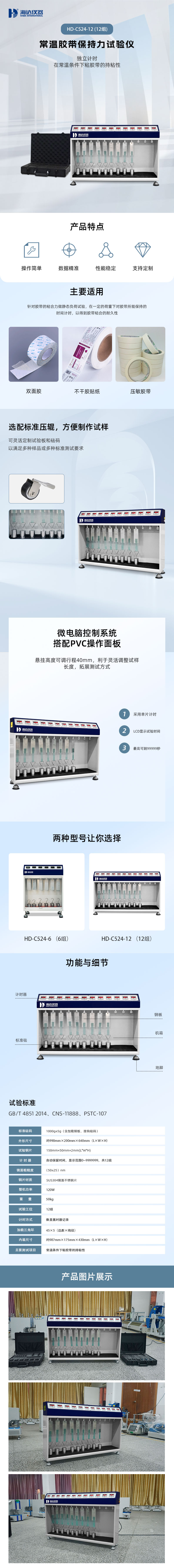 HD-C524-12 常温胶带保持力试验仪(12组),针对胶带的粘合力做静态负荷试验,在一定的荷重下对胶带所能保持的时间计时,以得到胶带粘合的耐久性。