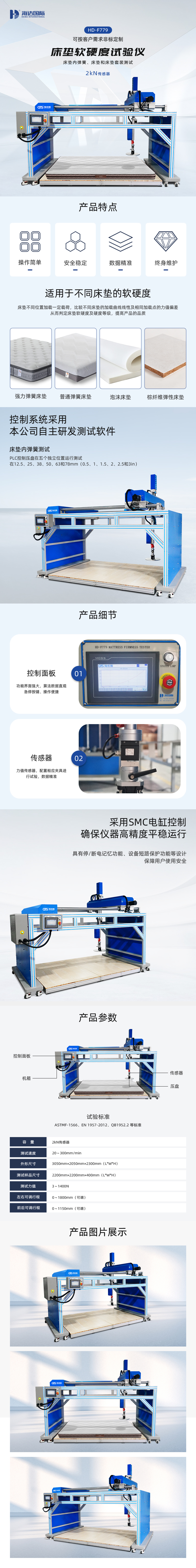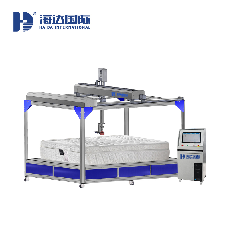 床垫贴合度及硬度试验仪用于对家庭、酒店、旅馆、饭店等场合使用的弹簧软床垫和发泡型床垫进行出厂成品检测,对床垫硬度和滞后损失率及贴合度进行测试,测试完成后根据测试评定试样的等级。