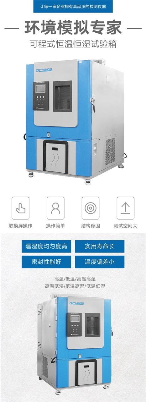 包装袋专用恒温恒湿试验箱厂家采用高稳定度之白金PT-100测温抵抗体,LCD中英文触控式/触摸式屏幕,附多组PID控制功能,配备RS-232C/485C连计算机接口控制,可模拟高温高湿/高温低湿/低温高湿/高温/低温等不同的环境条件,更搭配容易操作及学习的高准确性之编程控制及定点控制系统,提供*佳测试性能。广泛适应于产业界电子电器、**、塑料、五金、化工等行业,如:电子零件、汽车零件、笔记本等产品虚拟气候环境测试。